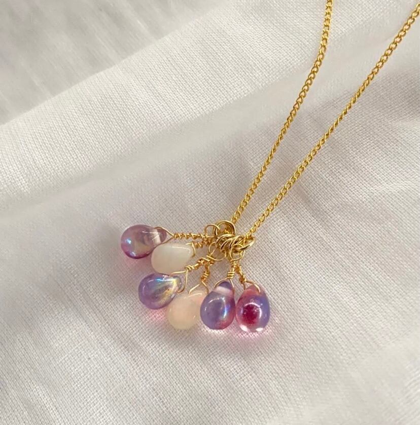 七色に光るパープルのガラスビーズと高品質オパールが胸元をかわいく演出します^_^