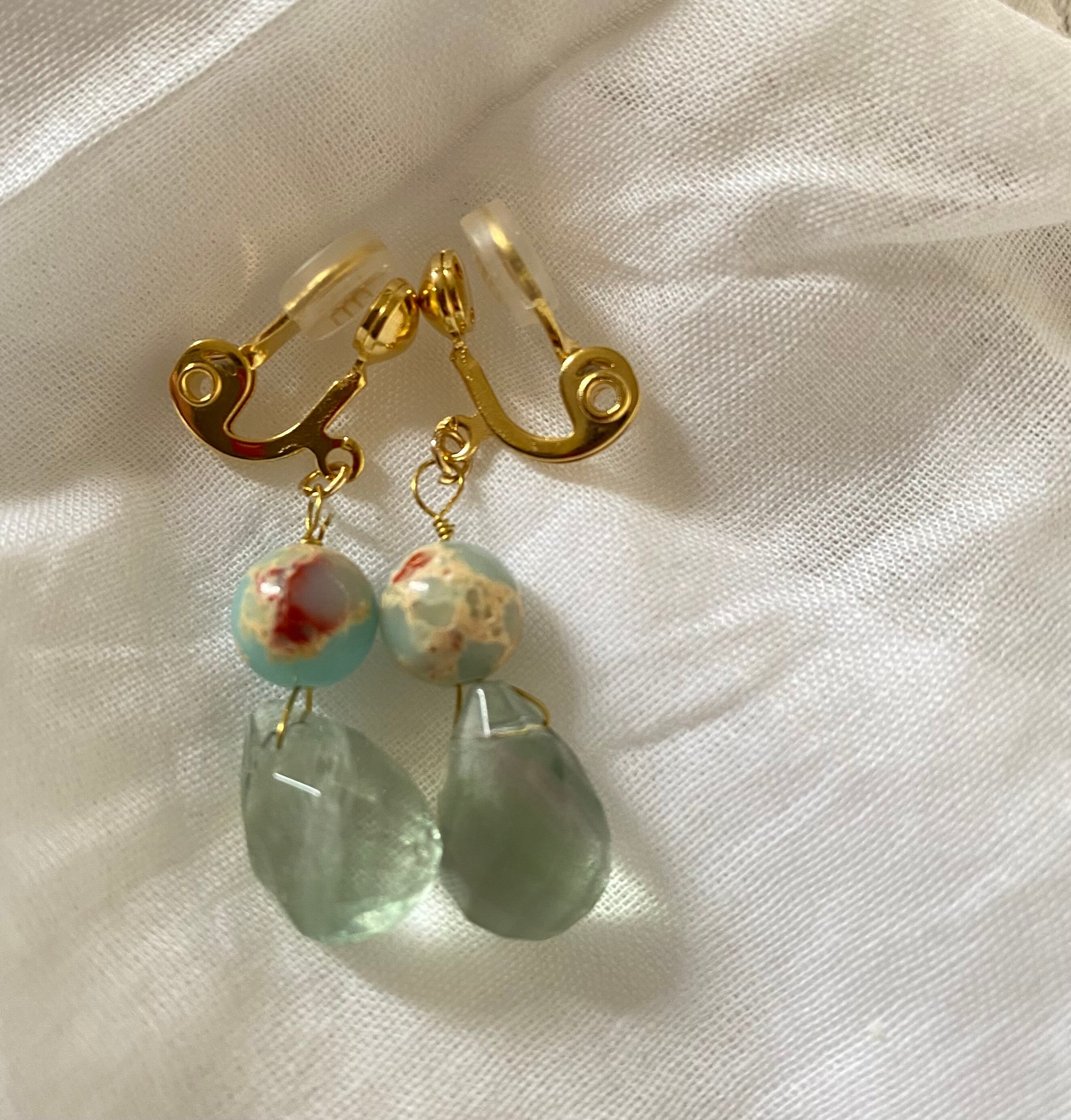 フローライトとインプレッションストーンの秋色イヤリング❤︎