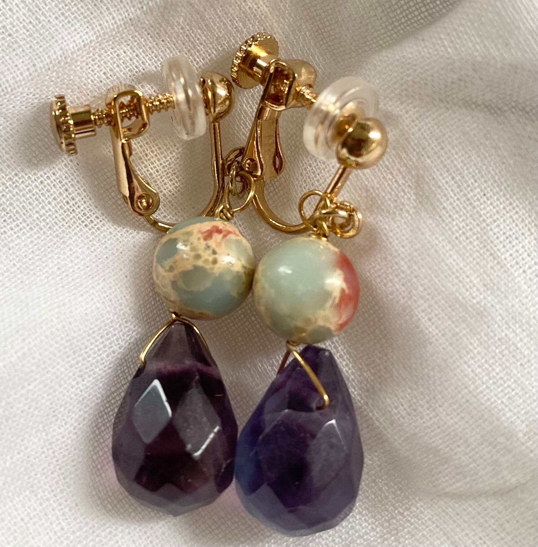 #天然石イヤリング #原石アクセサリー #パワーストーン #天然石ジュエリー #天然石 #ガラスビーズ #パープル #ハンドメイド #ハンドメイドアクセサリー #アクセサリー #夏 #秋 #イヤリング #ハンドメイドイヤリング #インプレッションストーン #フローライト