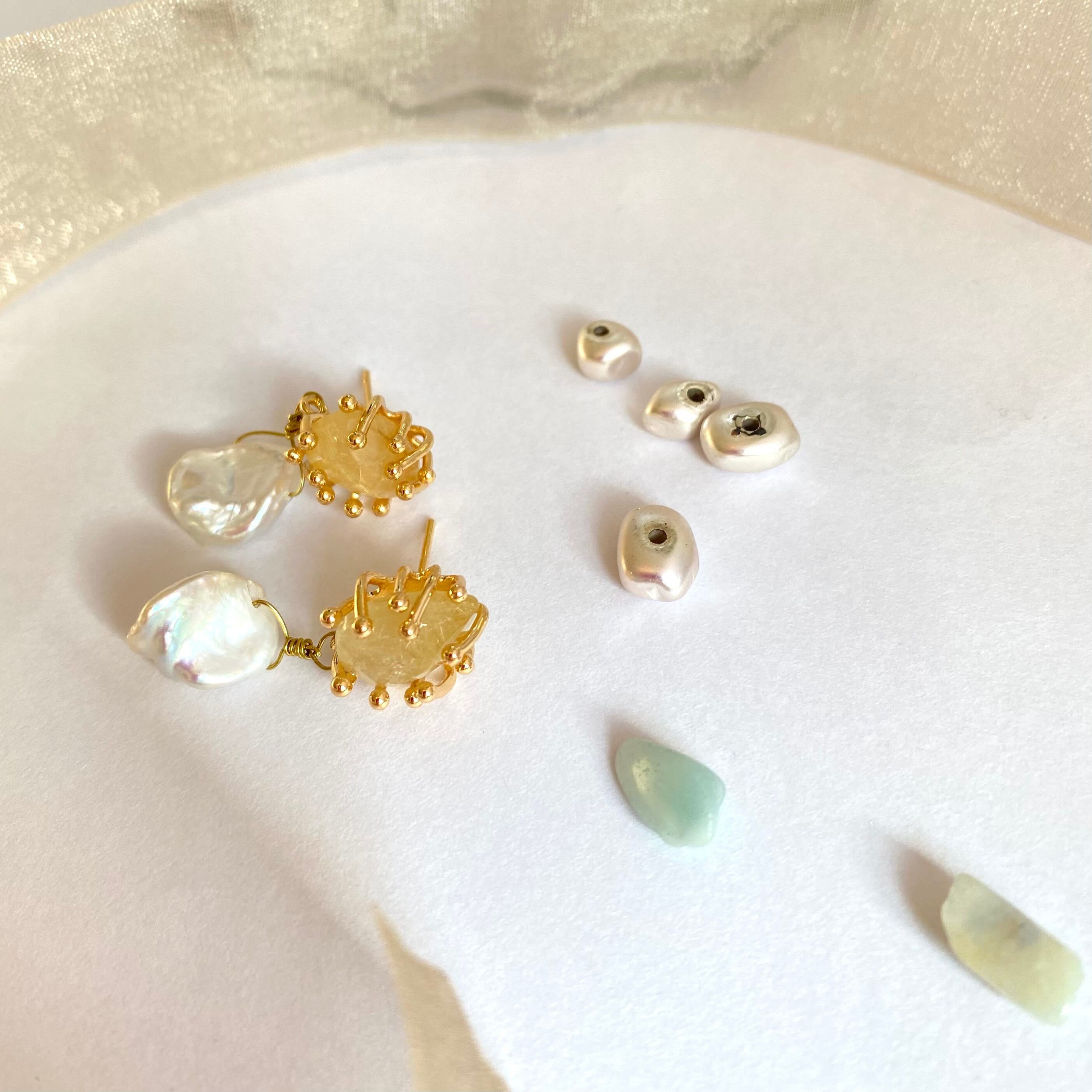 【ルチルクォーツとケシパールの天然石ピアス】