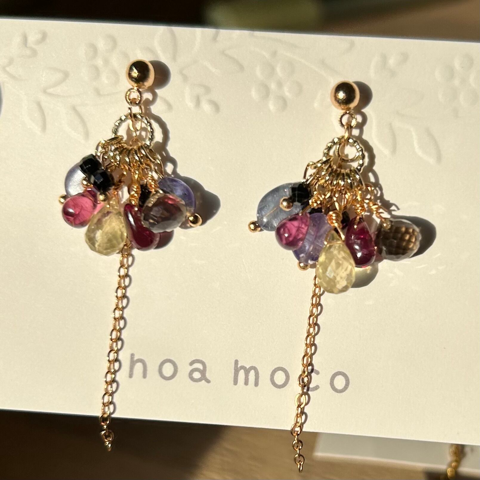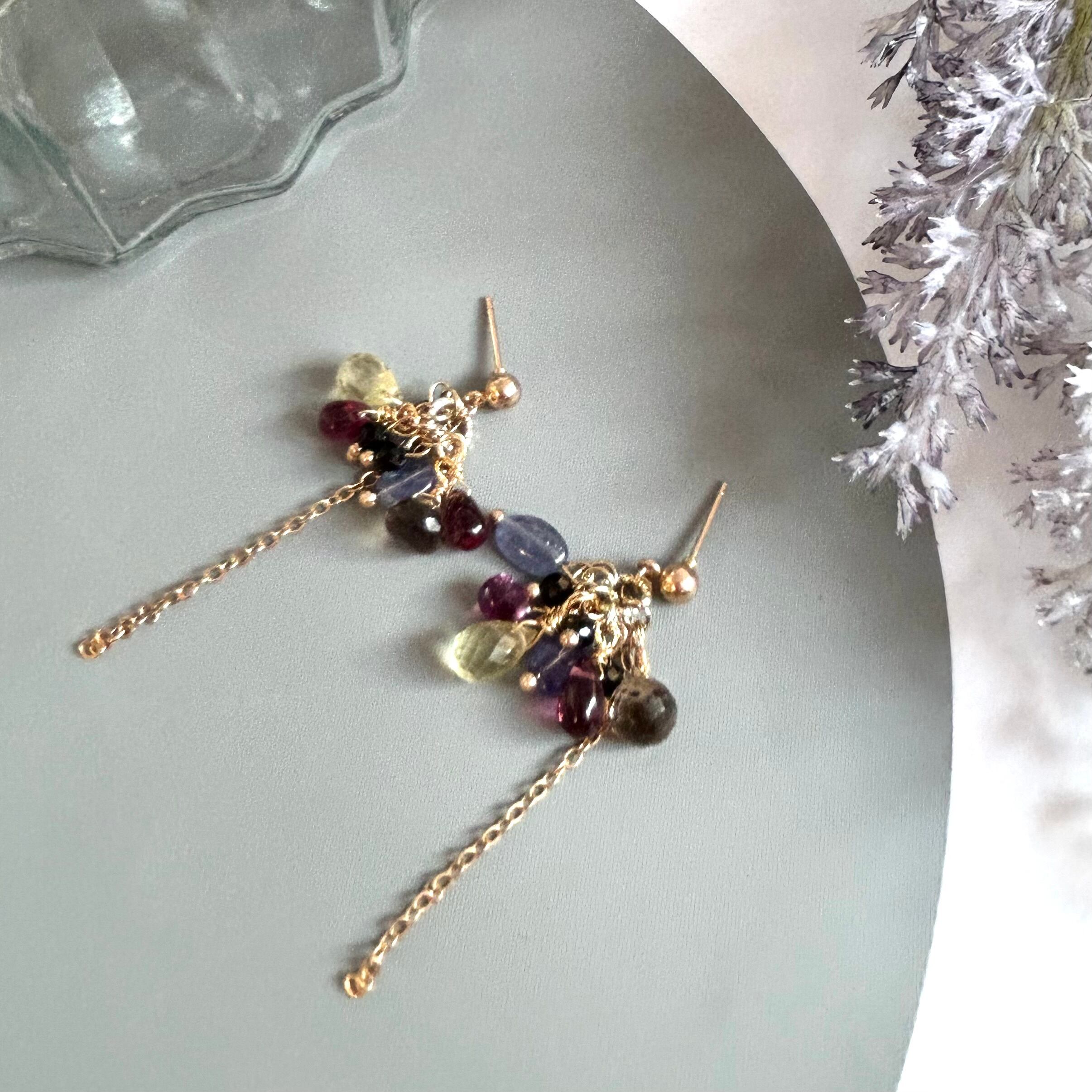 タンザナイトは、上品な紫色が美しく輝く天然石です。じゃらじゃらと揺れるデザインがさりげないアクセントになり、お顔周りを華やかに演出します。普段使いから特別な日まで、どんなシーンにも合わせやすい一点です