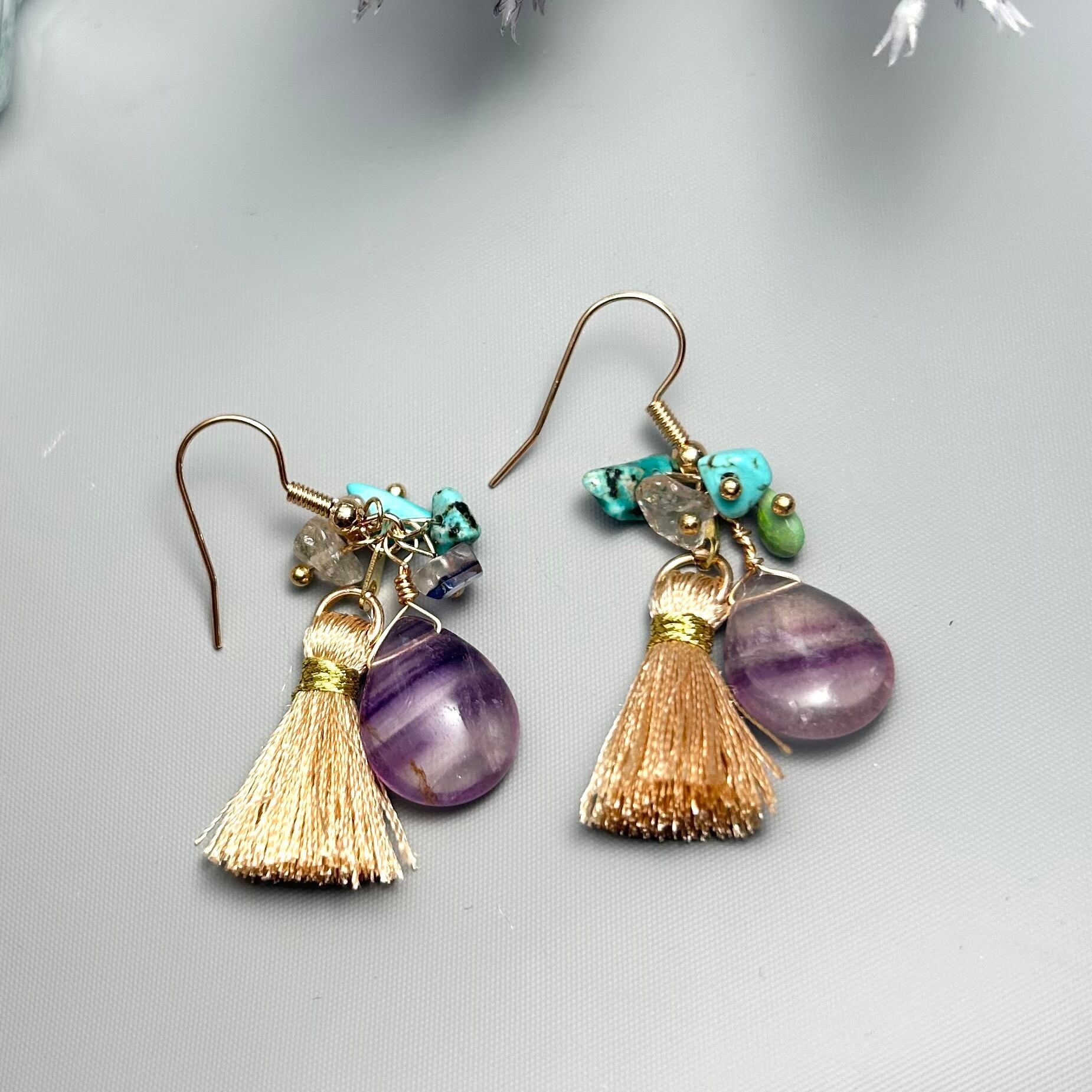 #原石アクセサリー #天然石 #天然石アクセサリー #ハンドメイドアクセサリー #天然石ピアス #ピアス #イヤリング #ハンドメイドピアス #アクセサリー #くすみカラー #大人可愛い #パワーストーン #春ピアス #フローライト #ターコイズ #タッセル